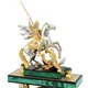Каждая деталь часов выполнена с исключительным вниманием к деталям. Фигура Святого Георгия Победоносеца, отлитая из бронзы, покоится на постаменте из натурального долерита, шпонированного благородным малахитом (известным своим происхождением из Конго) и латуни, безупречно покрытой золотом (20 мкм высшей пробы) и искусно украшенной ручной гравировкой.